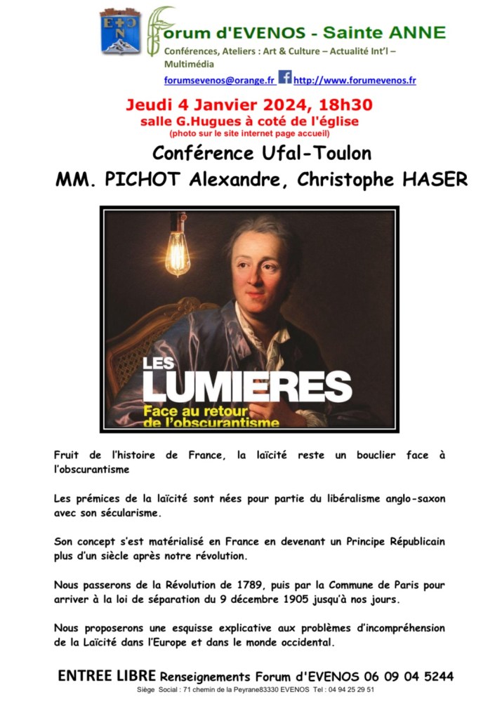 A l’invitation de l’association « Forum d’Evenos« , l’UFAL Toulon interviendra lors d’une conférence le 4 janvier 2024 à 18h30 salle G.Hugues à coté de l’église 🙂