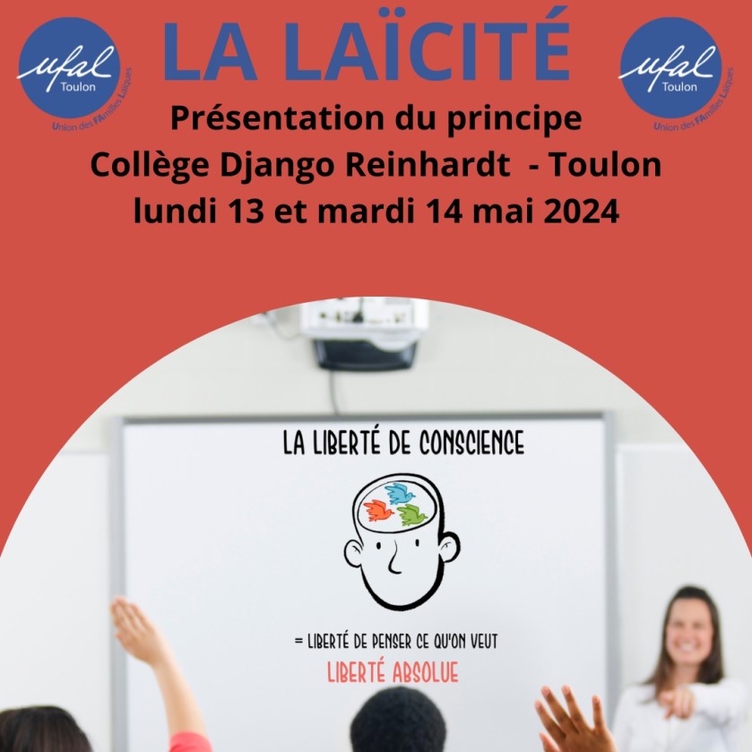 Ce lundi 13 mai ainsi que mardi 14 mai 2024, l’UFAL Toulon présentera le principe de #laïcité à des élèves du collège Django Reinhardt à #Toulon.